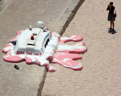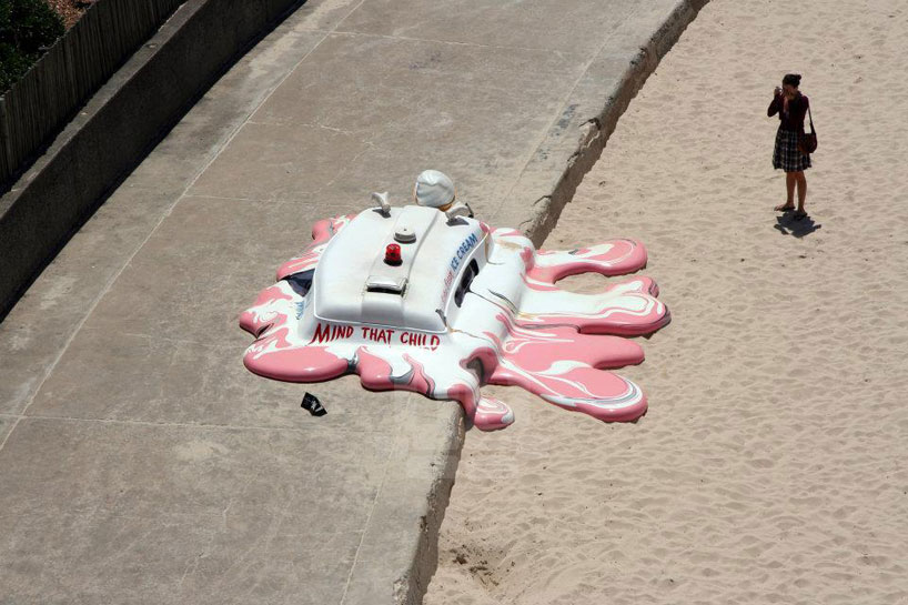 ‘hot with the chance of a late storm’, installation at sculpture by the sea, biondi, sydney, 2006, created by the glue society’s james dive. it is intended as a comment on global warming in which a melting ice cream van oozed onto the sand (the work has been touring australian beaches this year).