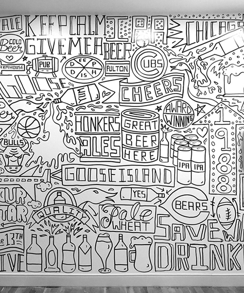 american artist and designer timothy goodman harnessed his creative talents for a 20x12ft (6x3m) mural at anheuser-busch’s new york city offices. created specifically for ‘goose island beer’, a chicago native brew, the piece was created in a single 10 hour freestyle. no prior sketching or planning was done, resulting in a stream-of-consciousness work that captures elements of ‘goose island beer’ and its origins.