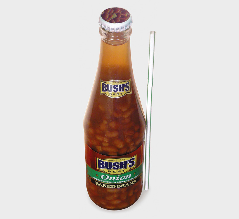 many foods we eat — from macaroni and cheese to baked beans — can be found cased in boxes and cans, the contents invisible to the everyday consumer. artist and designer tom davie emphasizes the obscurity regarding what’s actually inside by instead making their packaging transparent and containing them in a glass canister. ‘bottled food’ brings a slightly sickening insight into our popular supermarket finds, exposing the reality of their typically unseen ingredients and contents. a bottle of bush’s brand onion baked beans looks much more unappetizing when we’re able to see the swampy brown liquid they’re submerged in, and the bubble-gum pink slush that is the popular potted meat looks nearly inedible. in the process, davie repackages the food products using the original contents and prepares them for consumption.