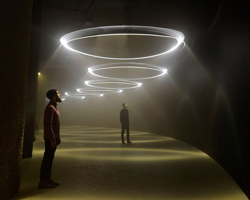 london’s barbican center has commissioned british art and design studio, united visual artists (UVA) to take part in ‘curve art’, a program launched in 2006 to artistically occupy the rounded space behind the cultural institution’s concert hall. in response, the creative team has produced ‘momentum’. the multi-sensory installation immerses the observer in light and sound, turning the corridor into a musical instrument, to which pendulums dance above. as they move, the space is transformed with patterns of light that vary from simple stripes to platonic geometric and floral forms. they play of illuminated areas and shadow creates an ever-evolving atmosphere through which, visitors are invited to linger, taking their time, moving at their own desired pace to the beat of the music.
