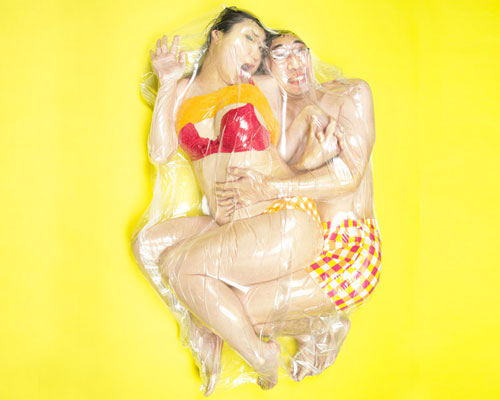 tokyo-based artist photographer hal has created the ‘flesh love’ series. his body of work explores the concept of worldly love through couples. in ‘flesh love’, hal pulls the lovers so near to one another that they transform into a single being– a vacuum-sealed pack of love. the artist wraps blankets the models with a plastic sheet in which he removes the air from to bond the lover together. hal is able to capture several photos in the few moments the couple is sealed within the plastic encasement.  the series is now available in a book compilation and an ipad application.