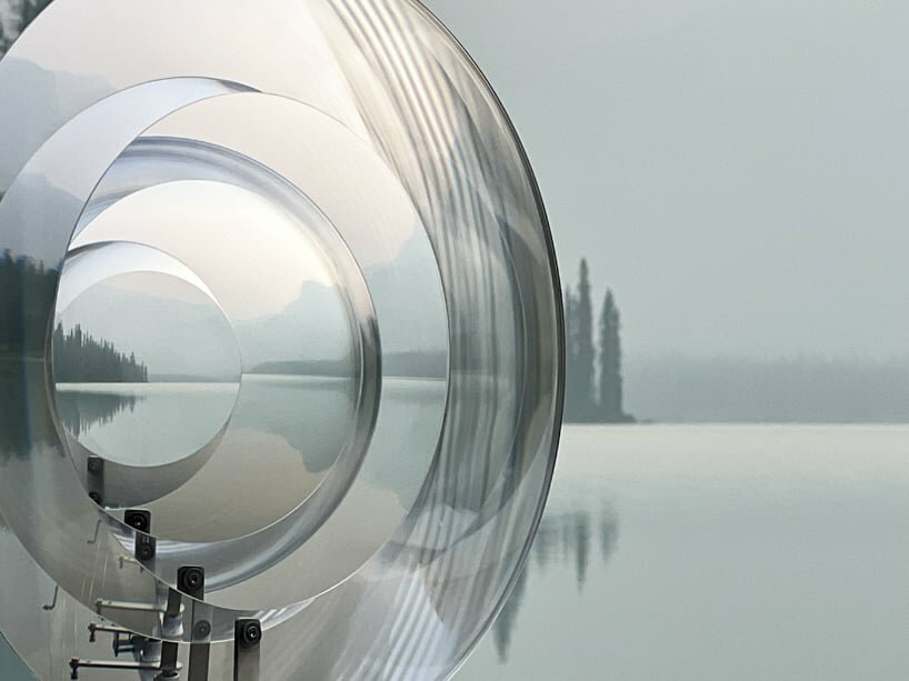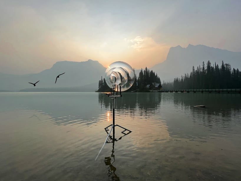 vincent leroy's hovering kinetic lens installation echoes the ripples of canada's emerald lake