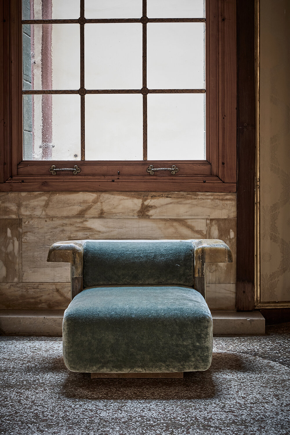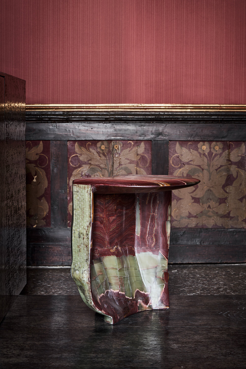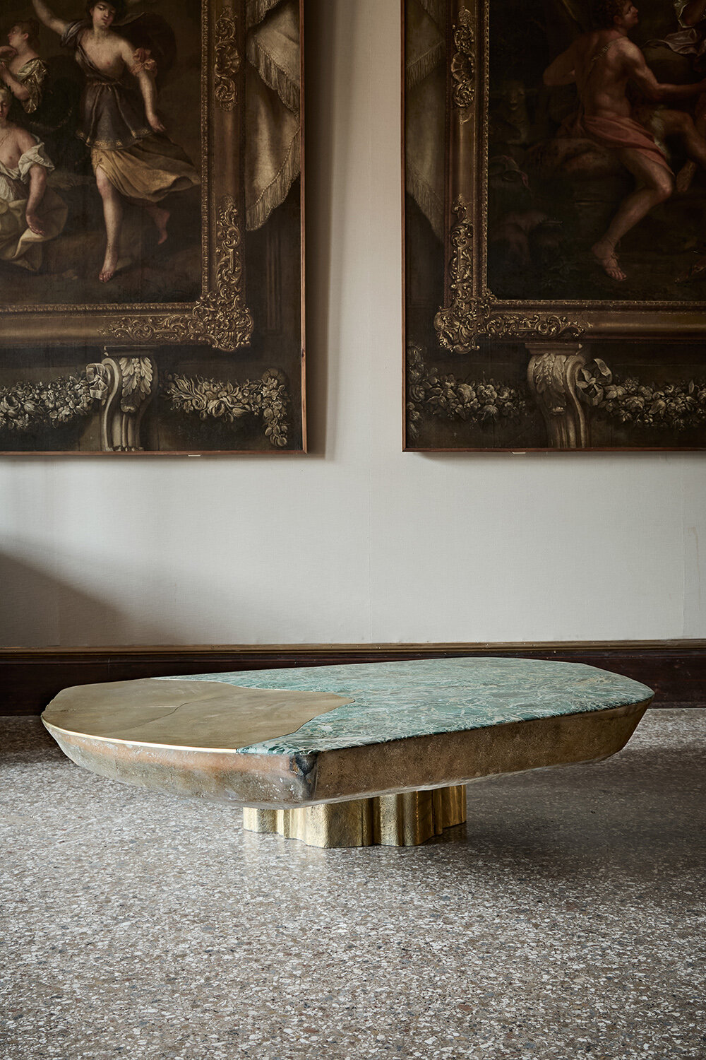 Vincenzo De Cotiis, DC2302 VENICE, 2023 | green malachite, cast brass, hand-painted recycled fiberglass, 37 x 170 x 154 cm | limited edition of 8 + 4 AP