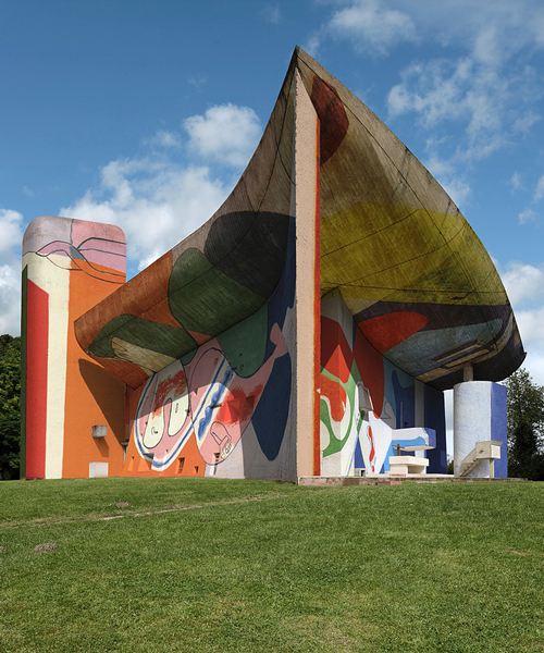 back in 2014, brussels-based artist xavier delory shared with designboom a series of images depicting le corbusier’s villa savoye ransacked and covered with defaced with wall writings — previously featured here. now, delory continues the theme by digitally canvassing le corbusier’s iconic chapel of notre dame du haut in graffiti inspired by the architect’s own murals. these paintings were completed for fellow architect and furniture designer eileen gray’s villa E-1027. vibrantly colored organic shapes and geometric motifs have been photographically overlaid onto the church’s unique structural facets — wrapping around its crab shell roof, concrete façades, and the small, irregular windows it has become best known for.