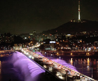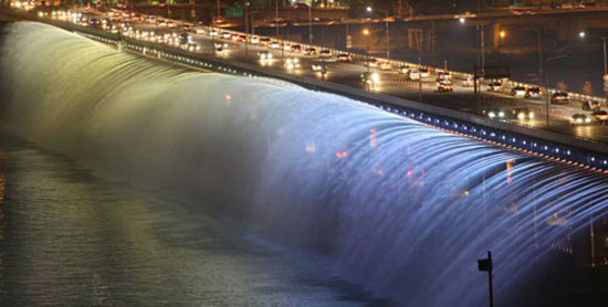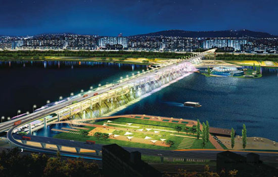 what used to be one of the many non-descript bridges crossing thehan river in the korean capital has now become a major attraction. banpo bridge has been remodeled into a massive and beautiful fountain that