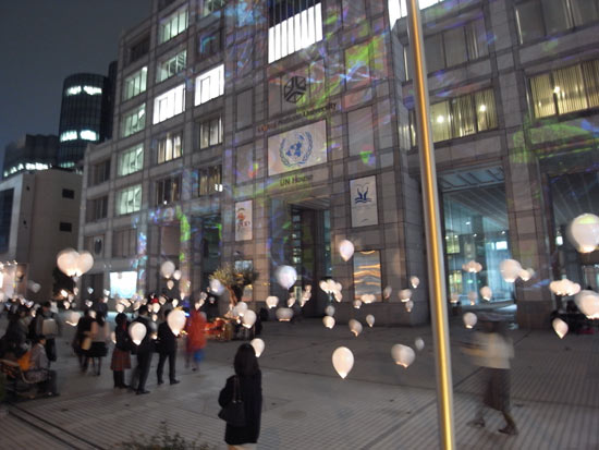 in front of the united nations university a party for ‘urban utopia’ was hosted, with live music by juvelen, DJs and talk sessions. the light installation was made out of LED lights housed in helium balloons, anchored to the ground just by the weight of their batteries.