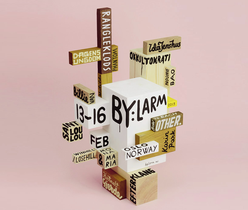 the identity for the 2013 ‘by:larm‘ music festival by frode skaren and rune mortensen centers around a wooden sculpture that grows as more bands are added to the line up.