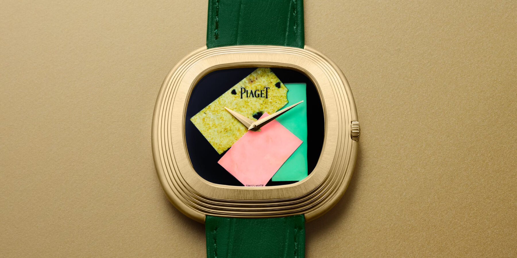 Art and timepiece design meet as Piaget draws inspiration from Andy Warhol’s 1986 Self-Portrait work for the design of its Collage watch. An interpretation of the structure and color composition in the renowned artist’s portrait, the Piaget watch is the accumulation of a six-month study of Andy Warhol’s work and archives. The watchmaker’s designers focus on integrating the idea of a collage into a small, functional object, and the result is a dial that uses stone marquetry, a technique that arranges small pieces of inlaid stone to form an image.  Many of the watch’s design elements refer to the relationship between Andy Warhol and Piaget.