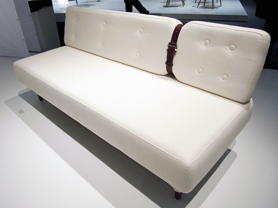 seen at stockholm furniture fair 2010 swedish designer anna kraitz created a new sofa for furniture company kallemo with a leather belt strapped around the backrest.