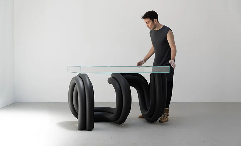 the table top is a glass box, its width proportioned to the flowing neoprene cylinders