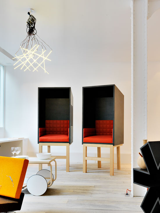 confessional in two parts, left and materials: black enamelled MDF, matte chestnut finish, feather cushion, felt cloth dimensions: H 210 x W 86 x D 87 cm