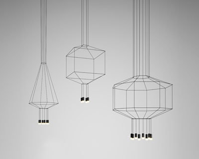 the metal rod elements make each lamp appear like a line drawing, suspended in air