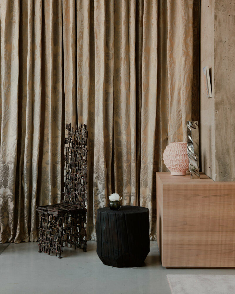 furniture, lighting, and objects crafted from traditional materials are on view at the gallery