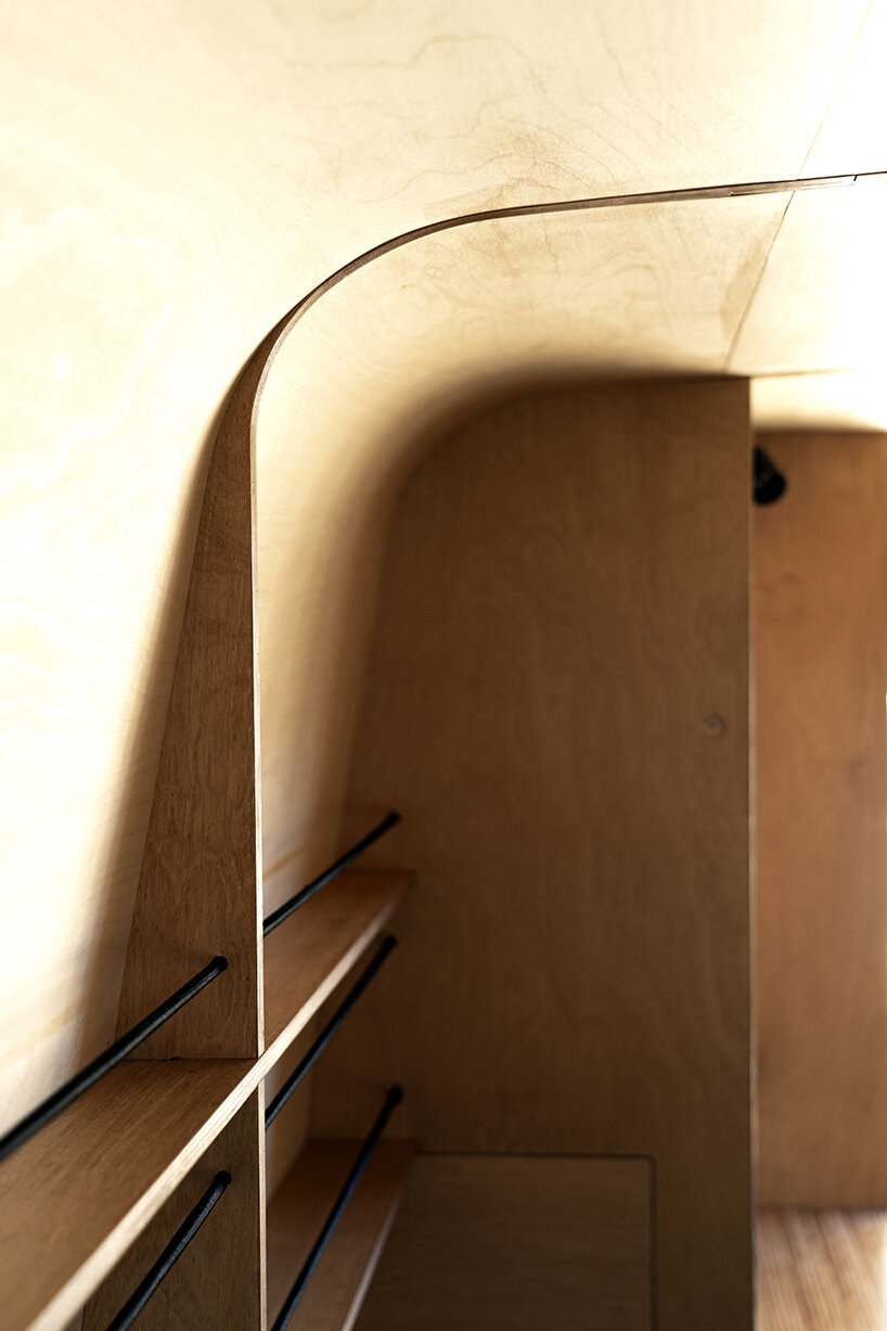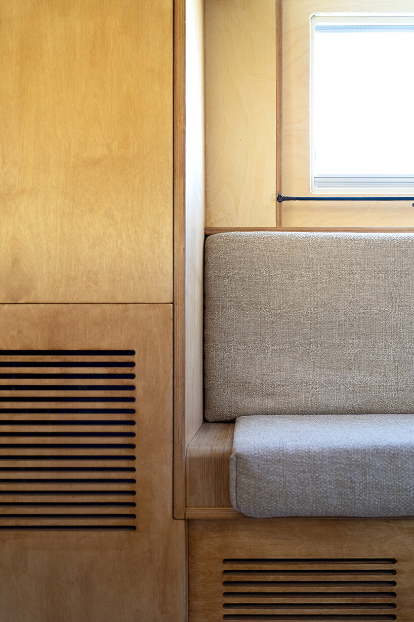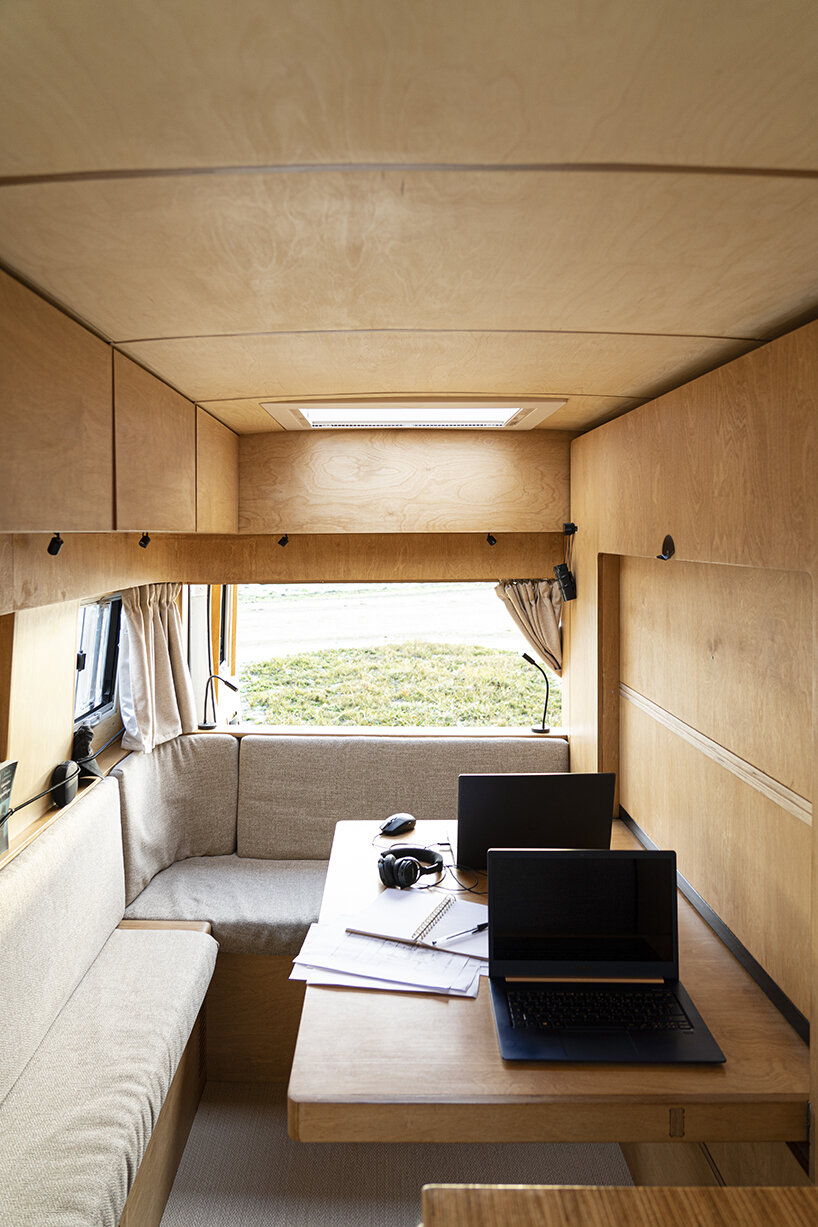 while converting the peugeot boxer, the architects worked on an easily adjustable environment to alter the living space configuration with minimum effort. this adaptability appears through the simple use of a completely retractable system, made of 15cm thick panels, that serves simultaneously as a double bed, desk, dining table, and storage. with this particular system, the 3m x 2m main area quickly evolves throughout the day, according to users’ needs — from free space to office for two, and sleeping area.