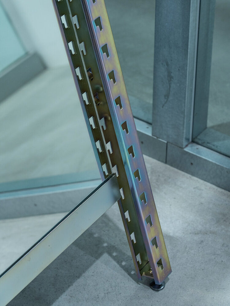 steel racks were repurposed and enhanced with a rainbow interference finish for a striking visual effect