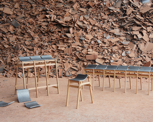 as ceramic waste products are difficult to recycle, eindhoven-based designer tsuyoshi hayashi has developed a clever modular seating system that salvages japanese rooftop tiles that would otherwise be discarded.  an entry of the [D3] young designers contest during IMM cologne 2014, the ‘kawara bench’ initiative preserves the rugged outdoor aesthetic of the reclaimed tiles, highlighting their smooth curve and unique texture in the form of an ergonomic seat pan. to render the benches and bar stools useful, the re-purposed waste-material is mounted on-top a simple wooden-frame construction to create a series of functional furniture pieces.