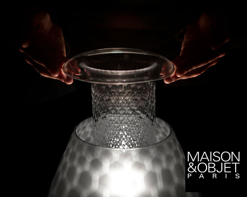the common interior component is hand-blown and then cold-worked using a traditional technique known as battuto, in which the surface of the glass is hand-cut on a girding machine to create a pattern of variable shapes and depth. light is then projected through the internal component, creating decorative caustics caused by the shadow and highlights of the motifs on the external blown glass part.