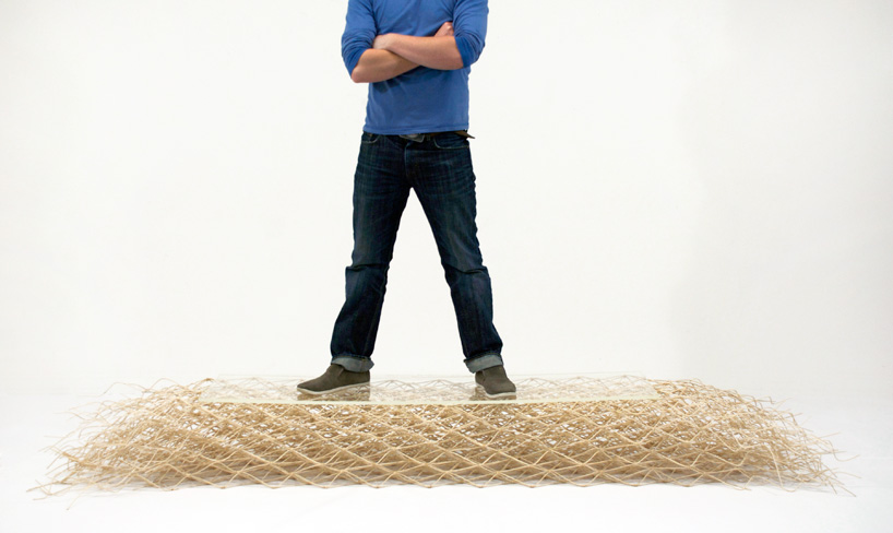 the reed is first soaked in a bucket of water, being malleable enough for the designer to weave it in and out of a mold to form a zig-zag shape