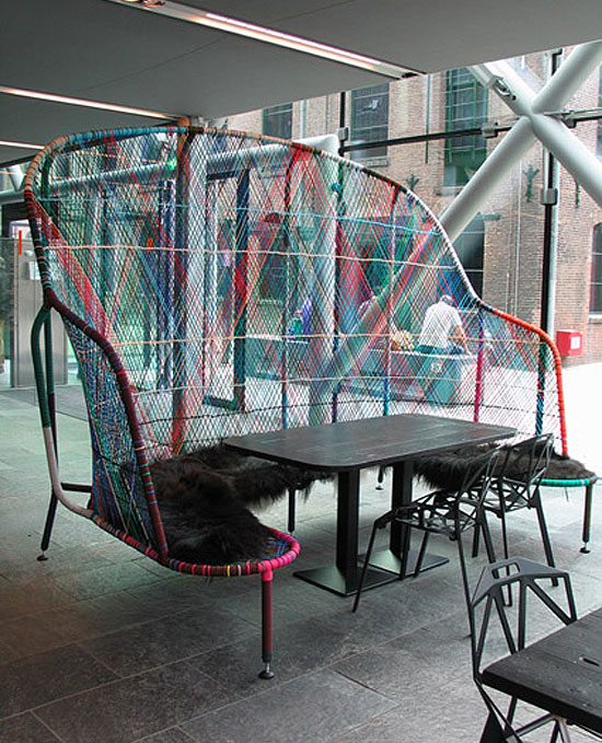 ‘big string-sofas’ by bertjan pot were developed for the audax textile museum in tilburg. the sofa’s are made from big steel frames that are coiled with polypropylene string in different colors. for the seat part he used skins from black sheep.