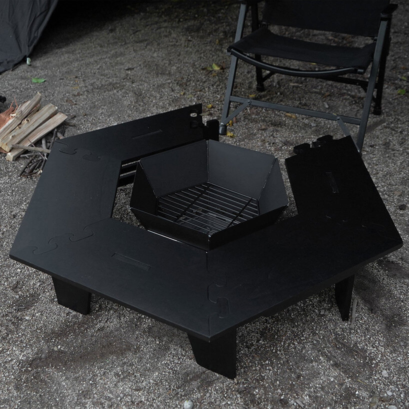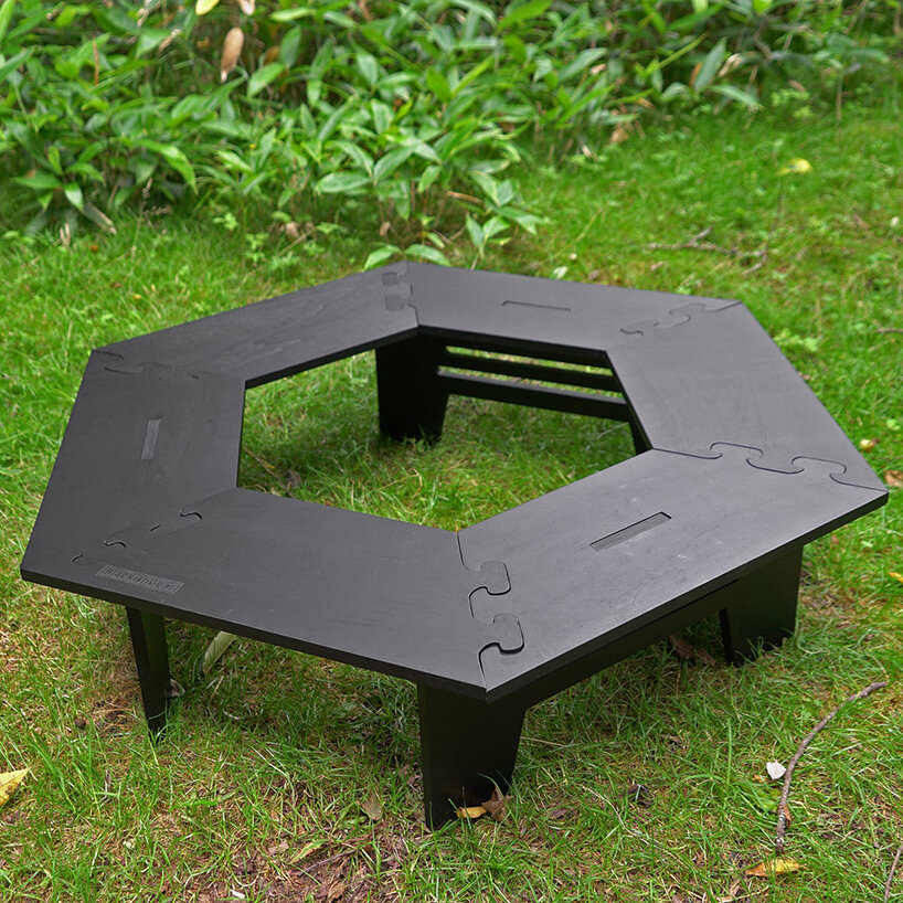 Perhaps BlackishGear’s trademark product, the Hexatable is a hexagonal table made of black-colored wood that darkens the atmosphere of the camp just by its presence. It is assembled like a puzzle by connecting its six wooden pieces together, creating an adjustable surface with a cavity in the center. This void can be used to set up a campfire or stove. It can also be passed through a single pole tent, allowing you to set up the table inside it. The Hexatable is adaptable and can be used depending on the situation, for example, half style for solo campers.