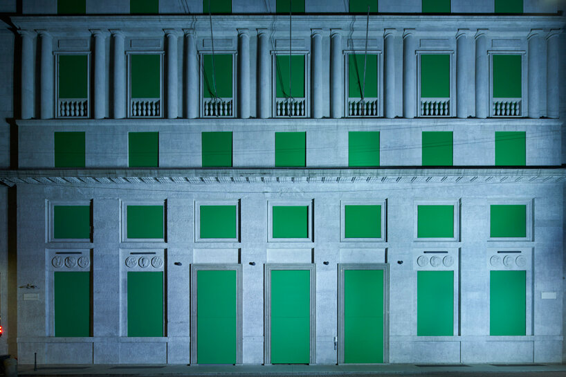 the building, which is still under construction, turned green for the fashion show with all the openings on the façade closed with panels in bottega veneta’s signature ‘parakeet’ color. the stripped back space inside created a raw aesthetic with traces of the past left exposed, echoing the concept behind matthieu blazy’s debut collection for the italian fashion house. in creative director matthieu blazy’s foundation collection there is a return to a fundamental questioning of the brand: a building on the past to realize the present and evoke the future,’  read the bottega veneta show notes.