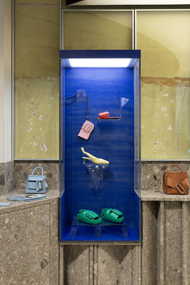Stepping inside the flagship store, it becomes clear that the aesthetic is anything but ‘polished’. Terrazzo tiles take over the floors while a series of stone-like gray cabinets and display stands complement the tiling texture — echoing its composite quality. In some corners, glazed boxes frame fashion items against a green-colored exposed wall. Completing this ‘rough’ interior look is a half-ruined column fitted with a display surface that recalls the color and texture of the cabinet series.