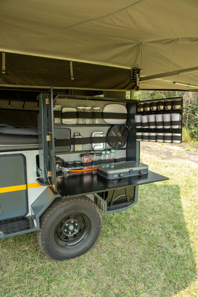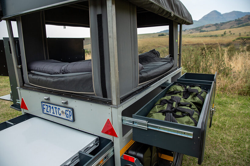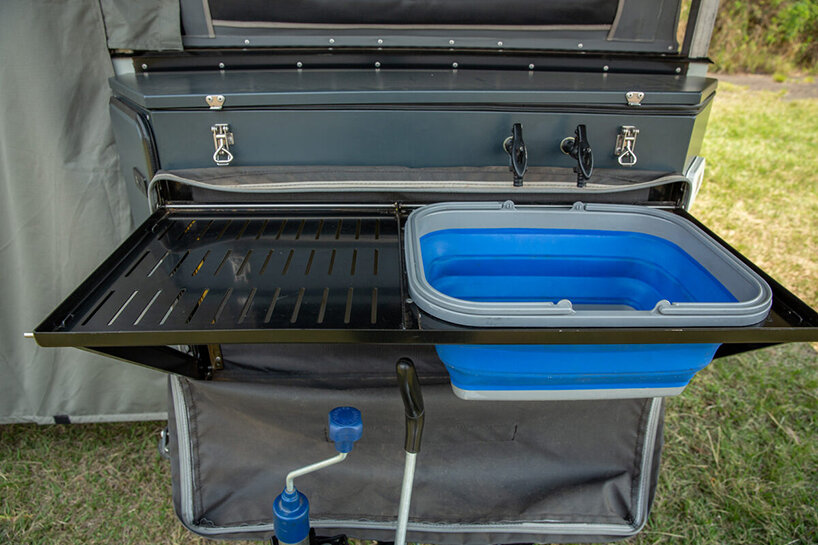 The kitchen, meanwhile, is stored as a large cabinet that slides out horizontally from the driver’s side before swiveling upwards. When fixed on its vertical axis, the cabin’s lower section folds down to accommodate a mini ‘countertop’ with a portable cooking stove. Two panels then open sideways, revealing fully-stocked ‘shelves’ with cutlery for six people and cooking utensils (pans, containers, kettle, mixing bowls, bottles, tongs, etc.). Moreover, campers can store food inside a fridge/freezer compartment that slides out next to the kitchen area. At the towing front, a collapsible sink basin with slotted shelving expands to make room for washing dishes, hands, etc.
