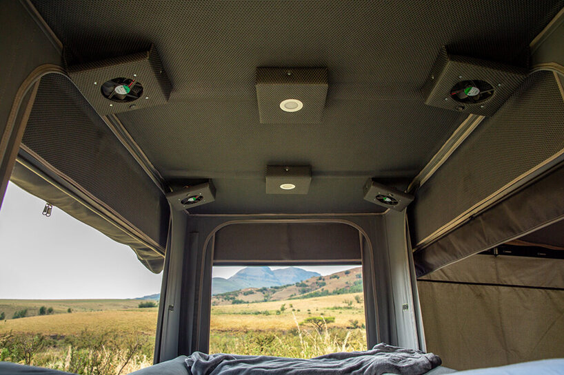 To set up camp, users can follow Bundutec team’s two-minute-long video, shared above. It starts with the electric roof tent lifting to its full extent, making way for a snug bedroom (BunduTOP) holding a 206 x 124cm mattress, four ceiling fans, and two LED lights; all four sides open onto views of the landscape ahead. Next, campers can unzip a bag at the top of the passenger side, letting a BunduSUITE tent drop down to serve as a private dressing room. Complementing the tent is a 360-degree awning that unlocks at the opposite side and swings around to meet the ends of BunduTOP, casting ample shade over the kitchen, front, and rear.