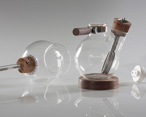 portugal based designer davide mateus has reimaginged the coffee-making process as a scientific experiment, creating a machine that looks to be straight out of a laboratory. made from two, delicate blown-glass flask incorporated with an electric heater at its base, the transparent system allows the user to visualize the brewing procedure and prepares in just a third of the time than an alcohol-fueled machine. based on the brief ‘coffee made at home’, mateus explores the root of why people choose to self-brew, and incorporates an entertaining and fun approach to the visual aesthetic. ‘cafe balao’ rethinks the caffeine kick, allowing coffee connoisseurs and casual drinkers alike to play the role of chemist.