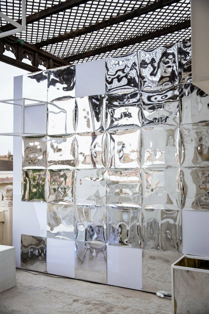 the design centers around a sculptural turntable topped with thirty-nine individual wooden tiles that flip and shift in real time as music plays.