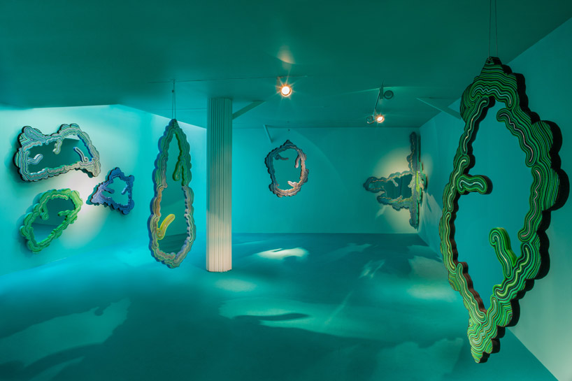 for their first gallery exhibition in france, the brazilian campana brothers have designed, in tandem with carpenters workshop gallery,‘ocean collection’. evolving from their signature ‘sushi series’, the furniture pieces include a ‘sushi buffet’ and ‘sushi cabinet’, a fresh expression of wall and pendant mirrors which are framed with felt, rubber carpet and EVA in different shades of green, blue and white to realize a liquid atmosphere, and four vitoria regia stool.