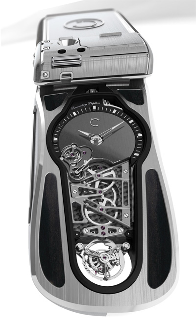 the watch mechanism is visible on both sides of the open phone