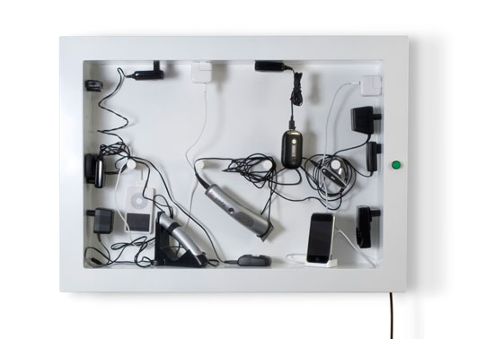 charging all your electrical goods can be hard trying to find plugpoints. hong kong company naolab have designed the ‘chargerframe’ where you can charge all your devices at once. designed as a hub for electrical devices it is a wall mounted frame that can be hung in a portrait or landscape style. you can control the energy consumption as each hot spot can be switched off. its white sleek frame allows you to contain those plugs that are otherwise unsightly.