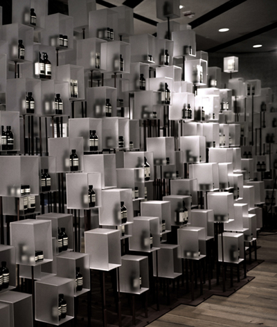 the use of steel rod which hosts each box makes the display appear as if it is being drawn upward by an invisible thread