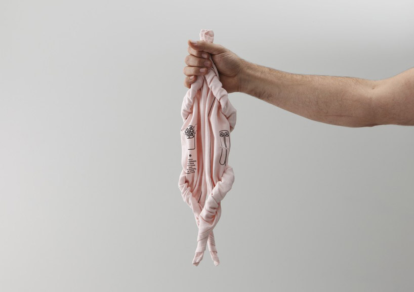 new zealand designers at alt group have created a kitchen towel with a twist. instructions printed on the pink cloth provide pictographic directions, guiding the user on how to twist, roll, and fold the fabric sheet into the symmetrical shape of a raw chicken carcass. likening itself to an origami project, the witty textile design was a gifted to attendees of appliance brand fisher & paykel‘s sales conference.