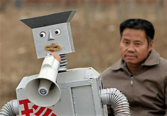 wu yulu adjusts his home-made robot at his home in a village at the outskirts of beijing.