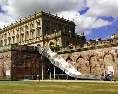 ‘what could be a time of disruption is being turned into an advantage, as the slide offers visitors to cliveden an original and unexpected experience – as well as a totally new way of looking at the house and garden. scaffolding surrounds the staircase, but this is topped by a 6.5m-tall walkway, which encases the staircase on all sides, giving views of the cliveden estate.’ national trust