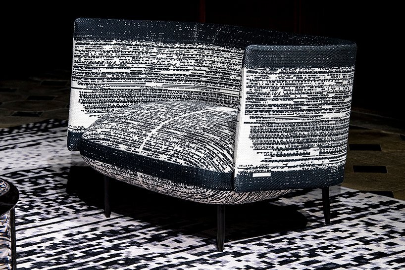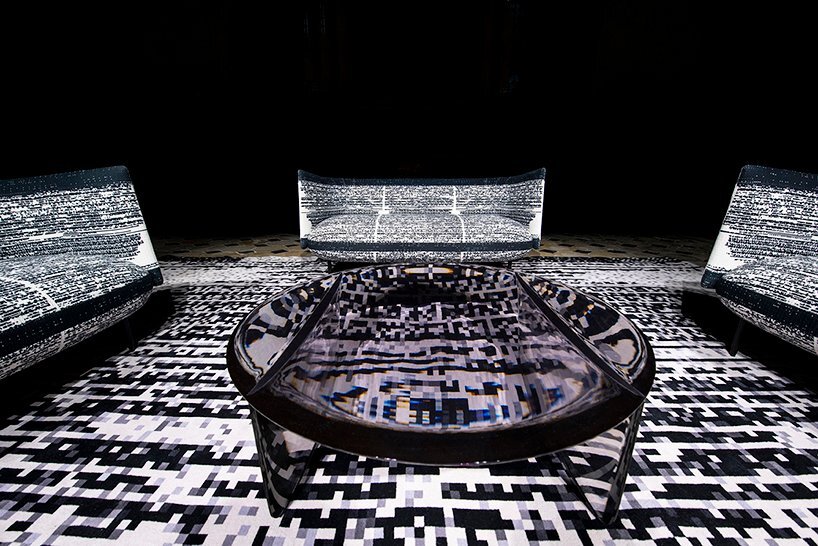 through this project, the creators sought to give users the opportunity to ‘sit down in a cloud of pixels’. the pattern of the rug, as well as the textile covering the furniture returns to the theme that is so dear to miguel chevalier, pioneering artist of virtual and digital art. these pixels are to him the ‘equivalent of the pictorial touch, the metaphorical image of the quantitative explosion of digital data which compels to find new ways to store the data, to see and analyze the world’. according to the french artist, the pattern also echoes the writings and the many laws drafted by the institutions of the republic where this collection of furniture shall be set.