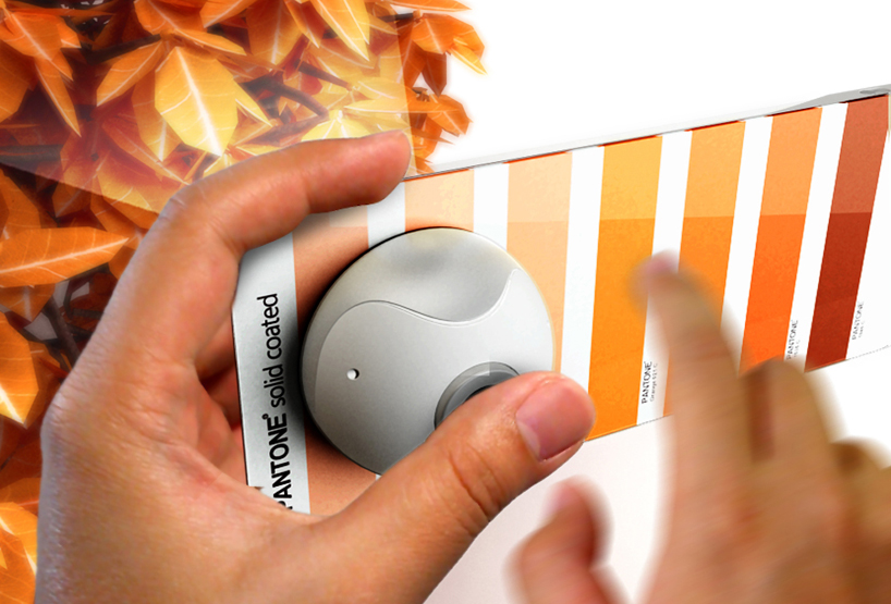 when disconnected from the scanner, the device serves as a swatch plate (left) from which users can preview colors of their selection (right)