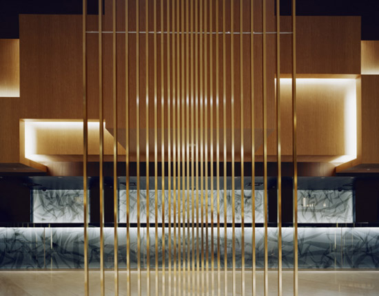 one of the main features is a metal sculpture located in a lounge space which is covered in walnut all photos by nacása & partners inc.