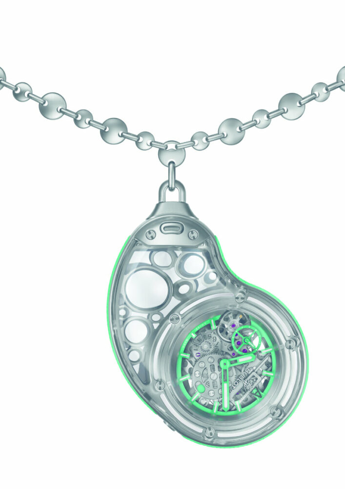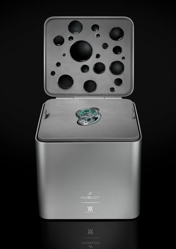 the two titanium chains feature Hublot’s patented double ‘one-click’ system