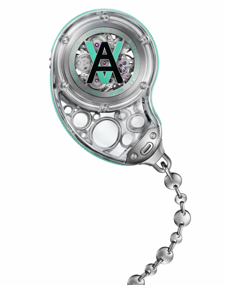 the pocket watch has a 10-day power reserve with Hublot’s Meca-10 manufacturing movement