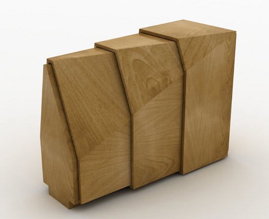 each component of the sideboard sits within the other with the door attached to the interior display shelf