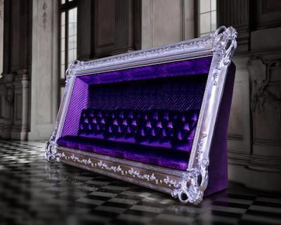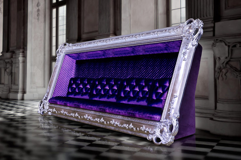 illuminating its surroundings the decadently extravagant ‘frame chair’ by bulgarian company slokoski has the ability to enliven whatever atmosphere it’s in. based on the idea of ‘memories yet to come’ the piece draws attention to itself like those posing for a portrait picture. constructed from lime-tree wood with a varnished finish of either silver or gold metal leaves, the frame feature easily stands out. interpreted as a multitude of styles, it is at once a classic, modern and contemporary structure, the hand carved construction is made from with plywood with a gray or deep purple velvet upholstery and heavy-duty caster wheels complete with brakes. slokoski’s unique design is on display for a limited time at the maison & objet, paris from the 6th to the 10th of september, located in the ‘funt@sy’ trends forum – hall 7.