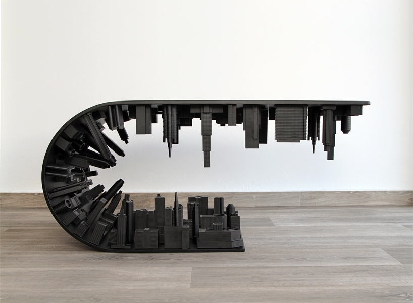 on display at the cities exhibit for design days dubai, the wave city coffee table by stelios mousarris is crafted from steel, wood, and 3D-printed PLA plastic — available in black or maple wood veneer. influenced by a documentary on tsunamis, the furniture combines the natural curve of a wave with a 3D printed and hand-painted cityscape. it represents the realization of moussaris’ desire to combine architectural models and industrial design.