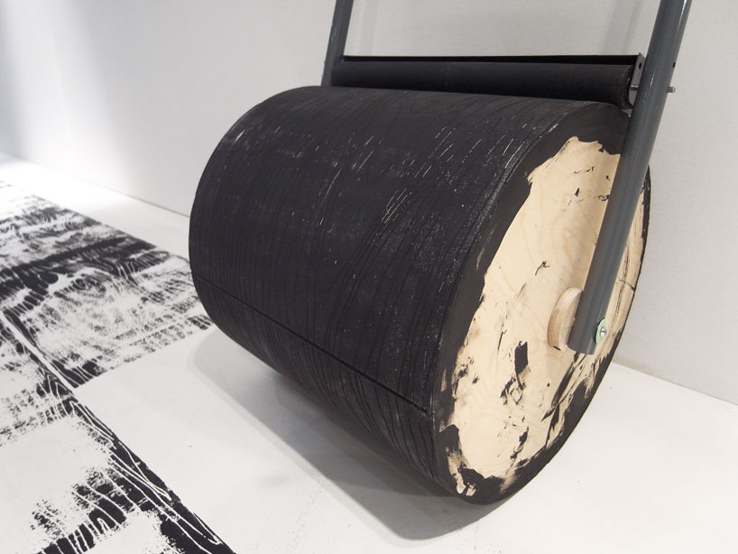 alonso created a large lino roller which prints ‘fake’ wood onto the floorimage © designboom