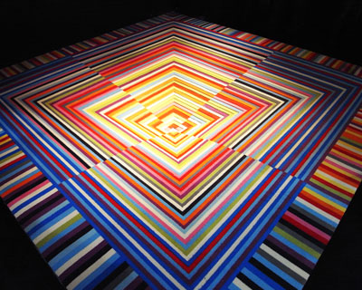 another notable installation was bureau mirko borsche‘s ‘kaleidscope’ which was realized with balta industries. the belgian flooring company specializes in printing on carpets, and in drawing on his graphic design background, borsche wanted to create an optical illusion, a striking 3D display. he layered pieces of carpet printed with a bold, colorful geometric pattern, in overlapping combinations, and cut out the centre to create two pieces, one which appears to recede into the ground, and the other which seems to be emerging. the resulting unified whole is a kaleidoscopic medley which achieves the effect of optical art or trompe-loeil.