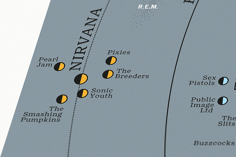 meanwhile, the ‘alternative solar system’ illustrates the cosmic influence of bands that dominated genres like brit pop, pop rock, punk rock, and so on. radiating their power at the center are the beatles, closely orbited by the rolling stones, pink floyd, david bowie, and the velvet underground. moving further out, the map features the ramones as a punk planet with the new york dolls, television, talking heads, patti smith, and blondie encircling it. at the edges, planet nirvana is orbited by the pixies, the breeders, and sonic youth. the system is completed with joy division appearing as ‘a cluster of aster making their own path around the sun, and jimi hendrix is a comet, blazing across the obits of other guitar legends – led zeppelin, cream and the yardbirds,’ reveals dorothy.