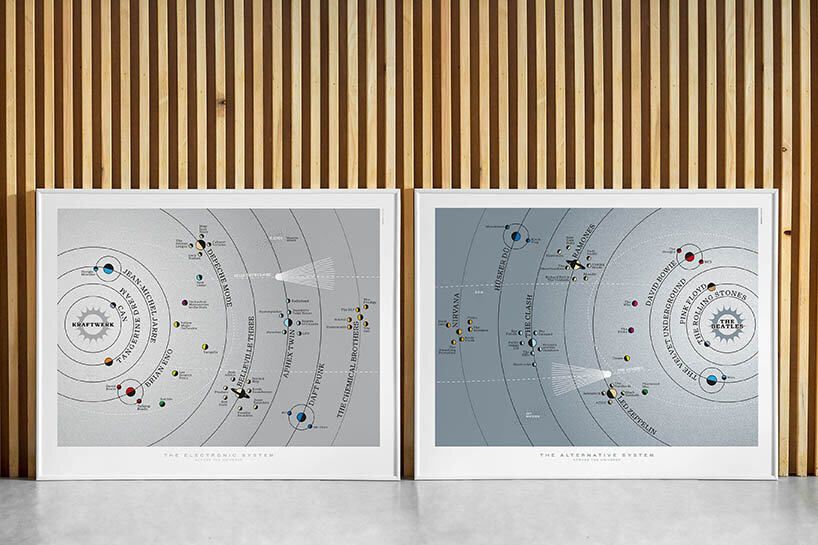 UK-based creative studio dorothy released two vintage-style prints depicting its take on the solar system. the artworks substitute the sun, planets, moons, and other satellites with the names of bands and musicians from the world of electronic and alternative music to convey the powerful connections between key players. ‘just like the planets orbit the sun and the moons orbit the planets, our new [solar system prints] map out the massive pull and influence that bands like kraftwerk, CAN, the beatles and the velvet underground have had on each other and the scenes and bands that have followed them,‘ shares the studio.