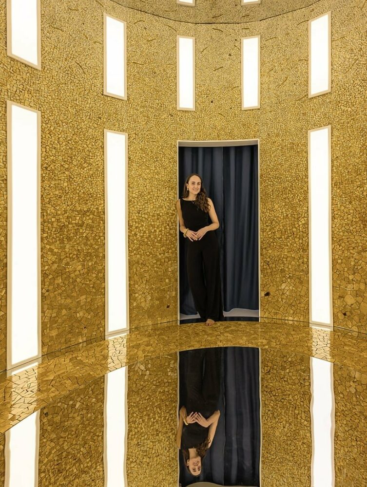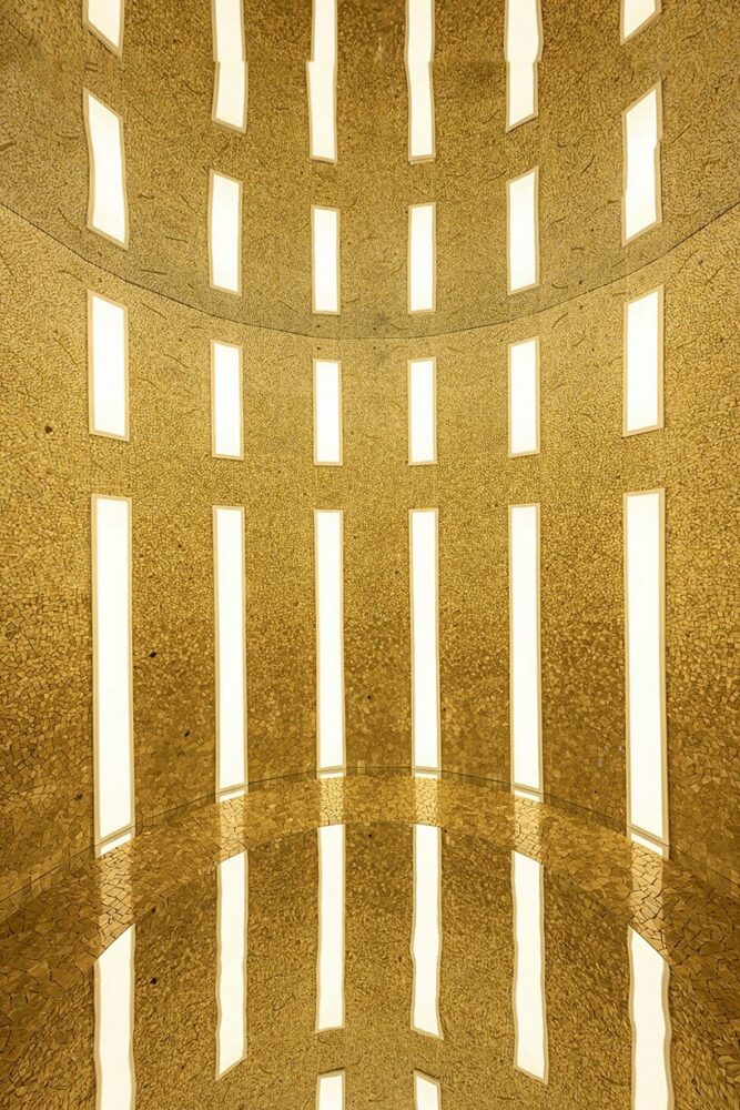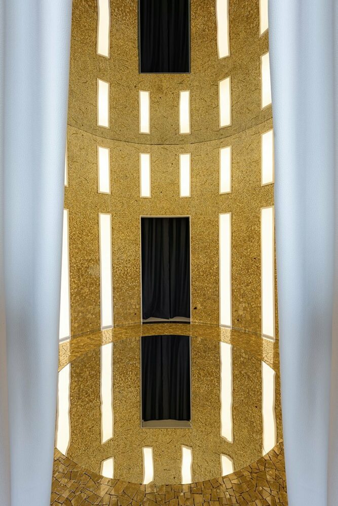The tranquil preamble guides visitors of the fair towards the octagonal pavilion that houses the Carved in The Now experience. The tactile leather curtains of the pavilion open to reveal a mesmerizing cave of light, composed of irregular and organic precious mosaic of yellow Siena stones, Murano glass, citrine crystals, and shards of gold leaf — all hand-crafted by the mosaicists at Fantini Mosaici, an Italian luxury surfaces company. Drawing inspiration from Dubai’s vision of a unified humanity, AB+AC Architects describe Carved in The Now as an encapsulating, kaleidoscopic room projecting the spiritual qualities of joy, abundance, and creative transformation through the infinite play of mirrors. This illusionary tower, seemingly carved from the cave, unfolds both overhead and underfoot, delivering a poignant message of invitation to slow down, discover, and replenish energy.